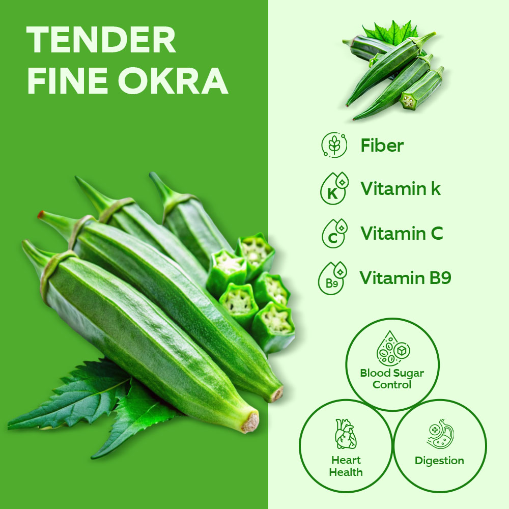 Our premium quality okra is tender and fine, ensuring a delightful texture with every bite. It is carefully harvested at the peak of freshness, which locks in its natural taste and nutritional value.