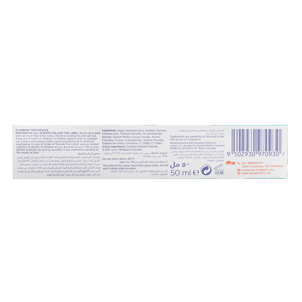With Aqua fresh Big Teeth Toothpaste, your child's oral health is in good hands. This specially formulated toothpaste gives extra care to their developing teeth, making it perfect for kids aged 6 and above. It comes in a convenient 50ml tube, ensuring that your child will have fresh breath and a confident smile wherever they go.The advanced formula of Aqua fresh Big Teeth Toothpaste is designed to protect young teeth from cavities and tooth decay. It strengthens the enamel, making it more resistant to acid attacks. This means that your little one can indulge in their favourite treats without worrying about dental issues.This toothpaste offers a triple protection formula that not only cleanses the teeth but also freshens breath and provides long-lasting protection throughout the day. It fights bacteria, leaving the mouth feeling clean and refreshed. With regular use, your child's teeth will stay stronger and healthier.Specially formulated for kids aged 6 and above, providing extra care for developing teeth.