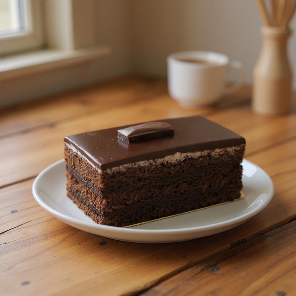 - Rich and moist chocolate cake slice, crafted with a velvety smooth sponge and layered with luscious ganache.
