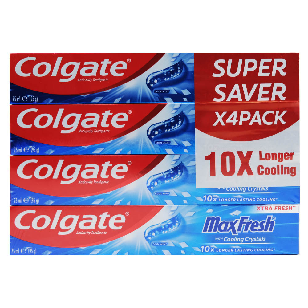 Refresh your breath and protect your teeth with Colgate Max Fresh Cool Mint toothpaste. This special offer pack comes with four 75ml tubes, ensuring long-lasting freshness and oral care.