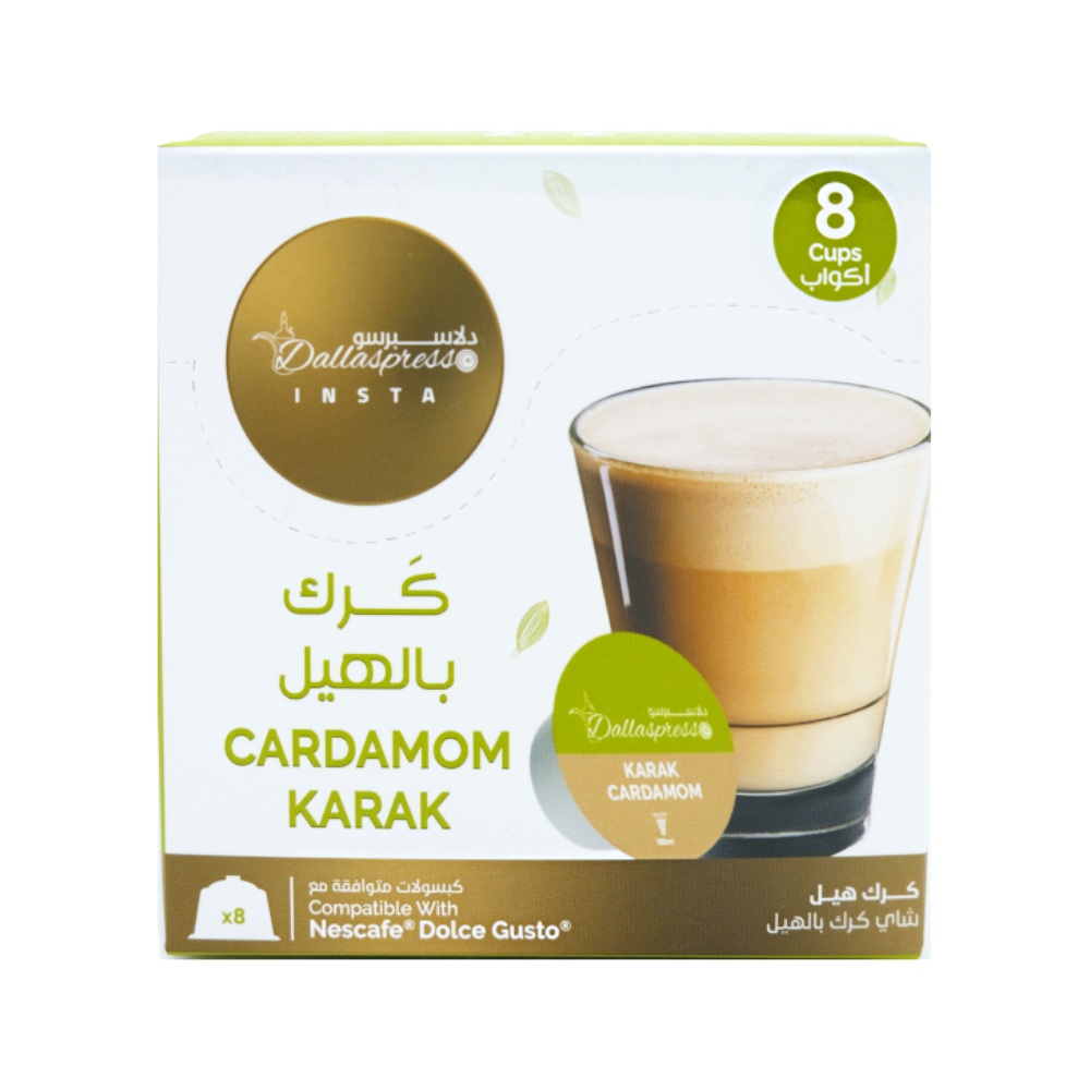 Experience a taste of the Middle East with our Dallaspresso Dolce Gusto Cardamom Karak capsules. Indulge in the rich flavors of traditional Karak tea infused with aromatic cardamom in every sip.