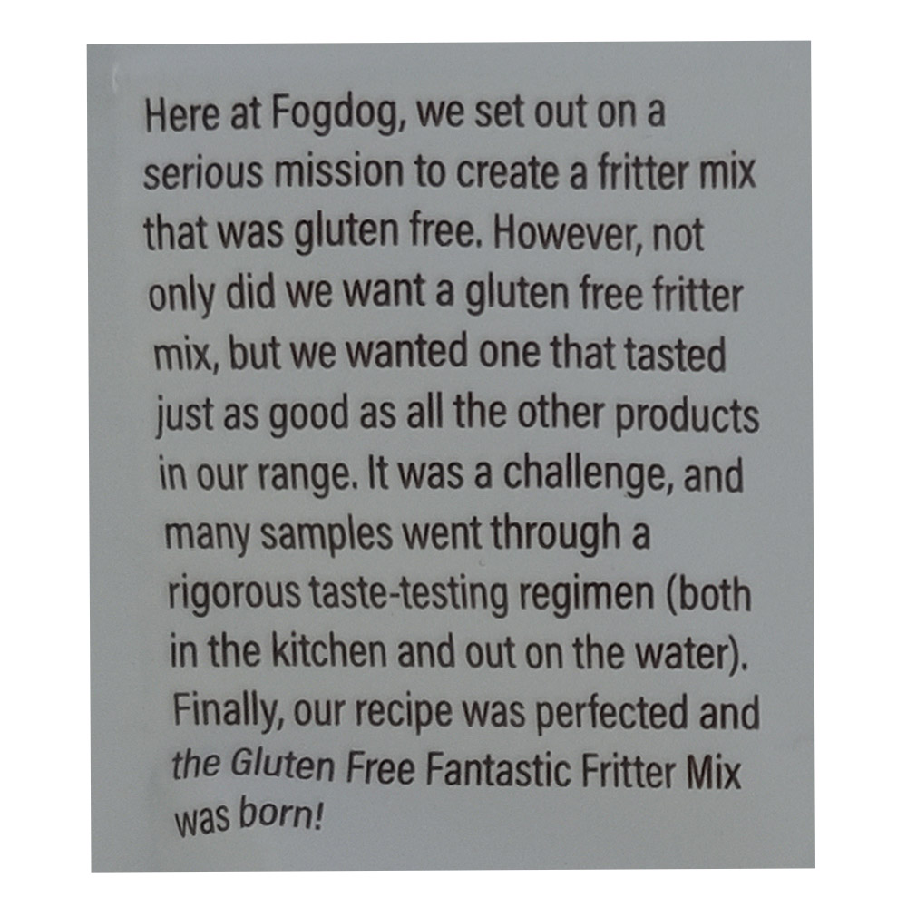 - Great for entertaining guests or enjoying a cozy night in Add Fogdog Gluten-Free Fritter Mix to your pantry and enjoy a hassle-free way to satisfy your cravings.