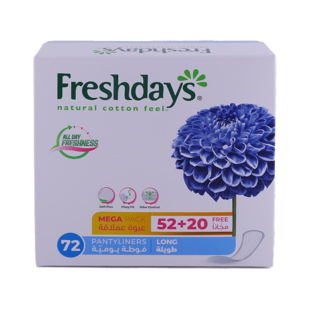 Stay comfortable and fresh all day long with Freshdays Long Pantyliners. With a pack of 52 + 20 pieces, this special offer ensures you are always prepared. These pantyliners are designed for ultimate comfort and protection, making them a must-have for everyday use.