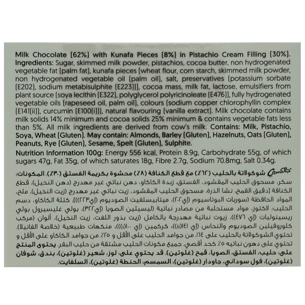 Indulge in the rich and decadent Galaxy Kunafa Pistachio Milk Chocolate. This unique fusion of kunafa pastry, pistachios, and creamy milk chocolate will transport your taste buds to a Middle Eastern delight.