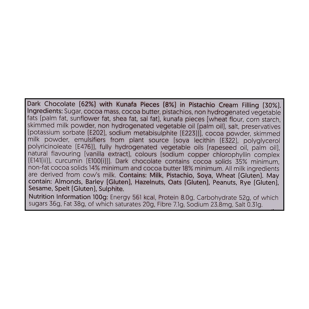 Experience a delightful blend of flavors with Galaxy Pistachio Kunafa Dark Chocolate. Indulge in the creamy richness of dark chocolate combined with the nutty goodness of pistachios, all wrapped in layers of sweet kunafa.