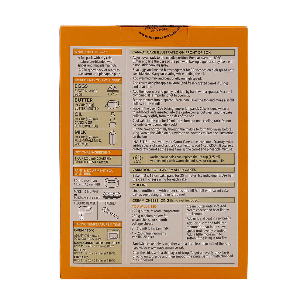 Indulge in the rich and flavorful Ina Paarman's Carrot Cake Bake Mixes. Conveniently packed with all the essential ingredients, creating a delicious, moist carrot cake has never been easier.