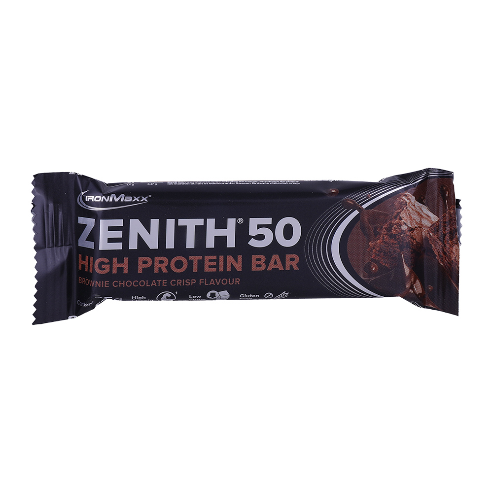 Indulge in the delicious Ironmaxx Zenith 50 Brownie Chocolate Chip Protein Bar for a satisfying treat that fuels your body with essential nutrients and energy.