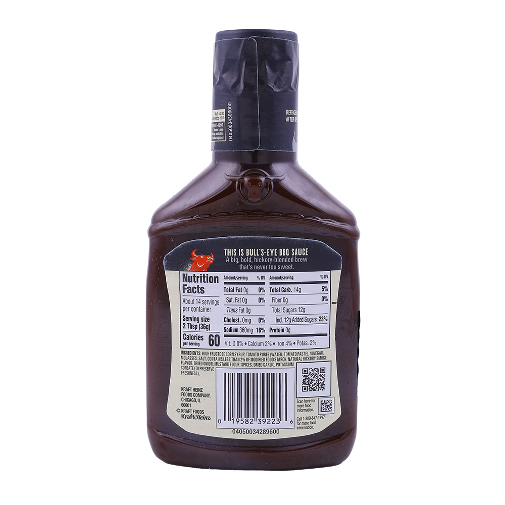 Enhance your BBQ experience with Bullseye Kraft Hickory Smoke BBQ Sauce! This savory sauce adds a bold, smoky flavor to your grilled meats and vegetables. Made with high-quality ingredients, it is sure to impress your guests at your next cookout.