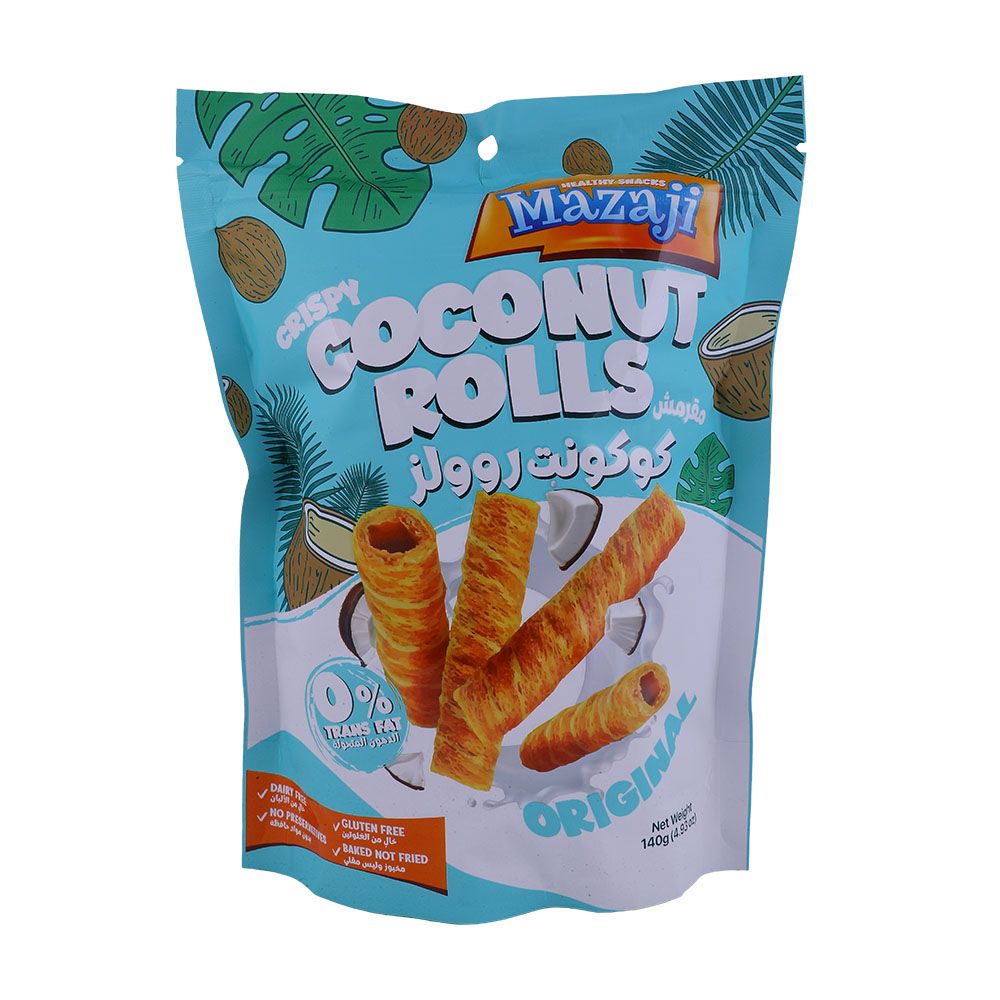 Experience the delicious crunch of Mazaji Original Crispy Coconut Rolls. These tasty treats are perfect for satisfying your snack cravings anytime, anywhere.