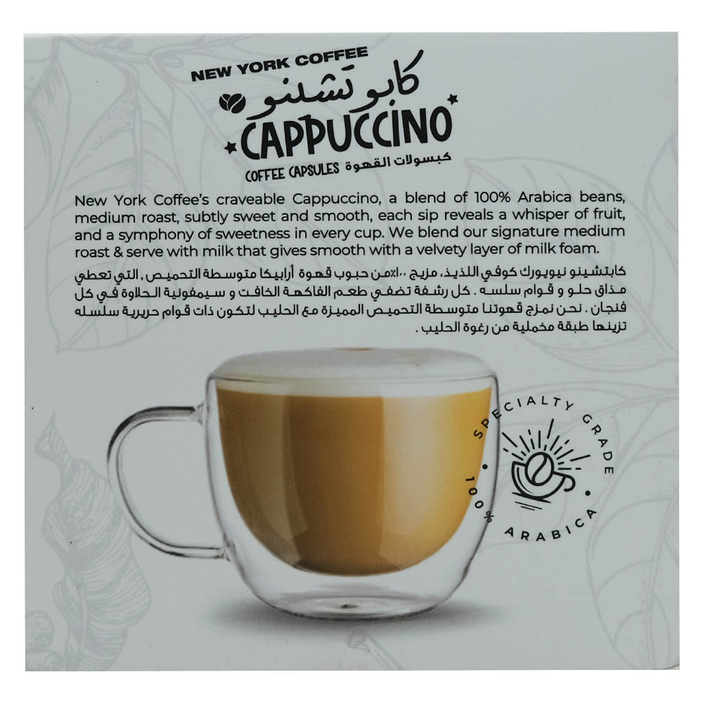 Indulge in the rich and velvety taste of New York Coffee Cappuccino Coffee Capsules. Each capsule is filled with aromatic coffee grounds that deliver a perfectly balanced and creamy cappuccino with every sip. Whether you're starting your day or taking a coffee break, these capsules are a convenient and delicious choice.