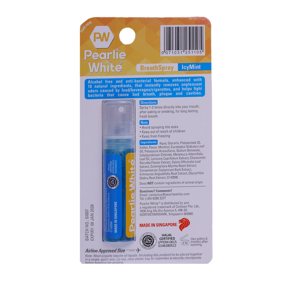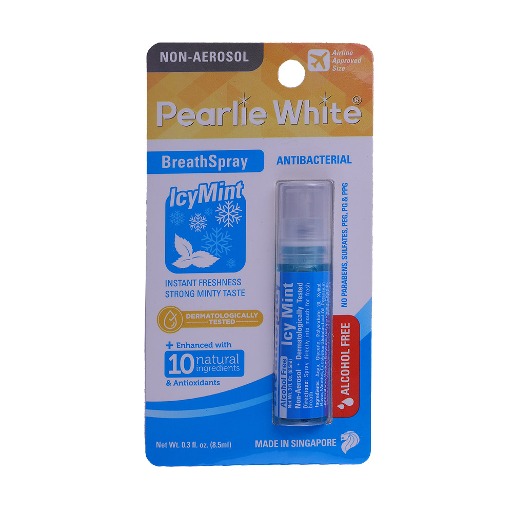 Keep your breath fresh on-the-go with Pearlie White Icy Mint Breath Spray. This convenient pocket-sized spray delivers a burst of cool minty freshness whenever you need it. Its compact design makes it easy to carry in your pocket, purse, or bag for instant fresh breath wherever you are.