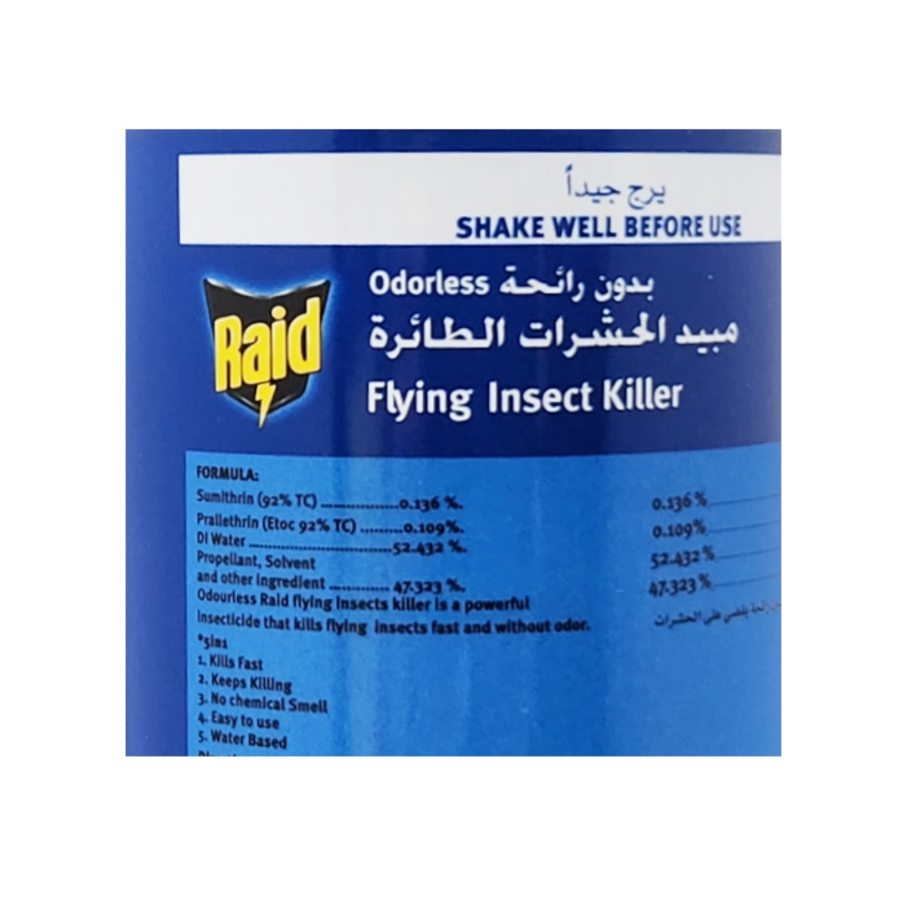 - Targeted application: The ergonomic design of the spray bottle allows for precise and targeted application. You can easily reach every nook and cranny where flying insects may be hiding. Say goodbye to pesky flies and mosquitoes with the Raid Flying Insect Killer Odorless 300ml. Its powerful and odorless formula, along with its convenient spray bottle design, make it the perfect solution for keeping your space bug-free.