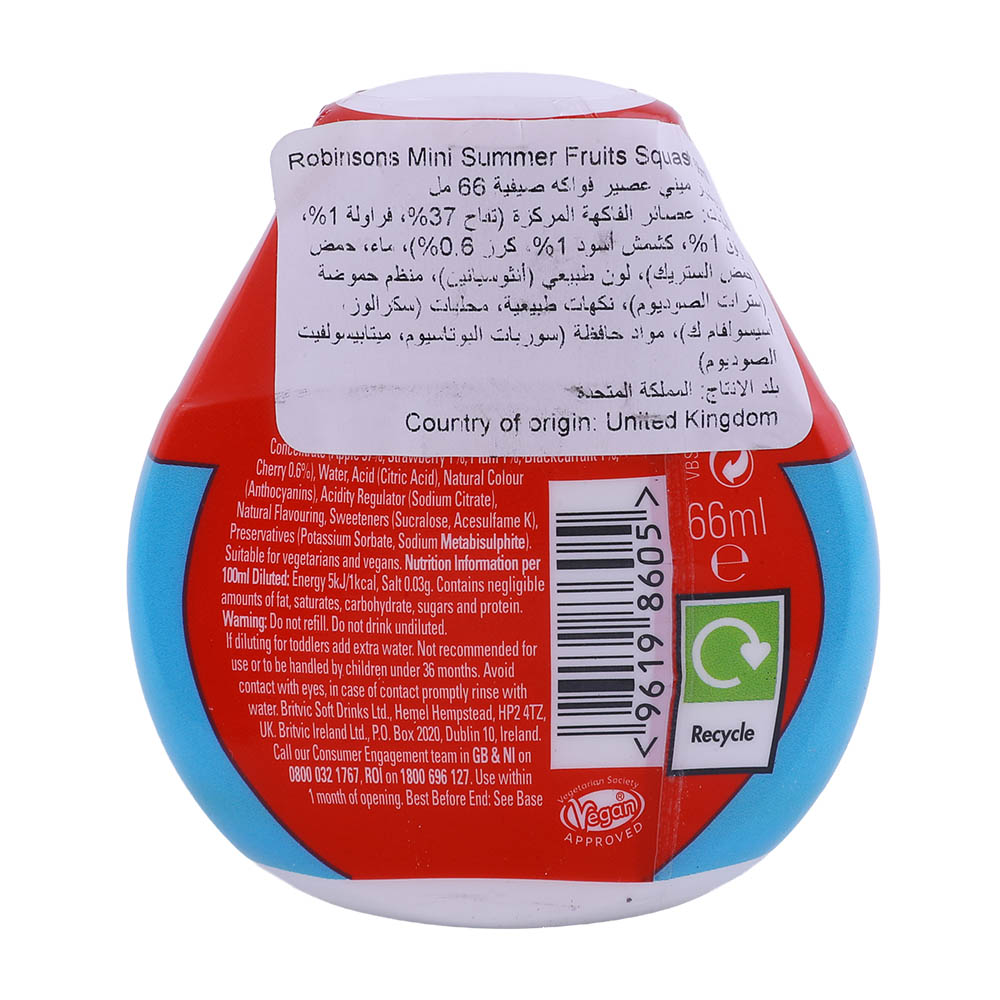Indulge in the refreshing taste of Robinsons Mini Real Summer Fruits Squash, a compact 66ml bottle of fruity goodness perfect for on-the-go hydration.