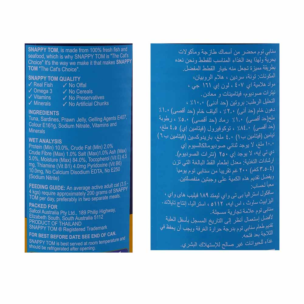 - The flavorful prawn jelly adds a delicious twist to your usual seafood dishes Experience a burst of flavorful seafood in every bite with Snappy Tom Tuna & Chunky Sardines in Prawn Jelly. Perfect for seafood lovers looking for a delicious and convenient meal option.