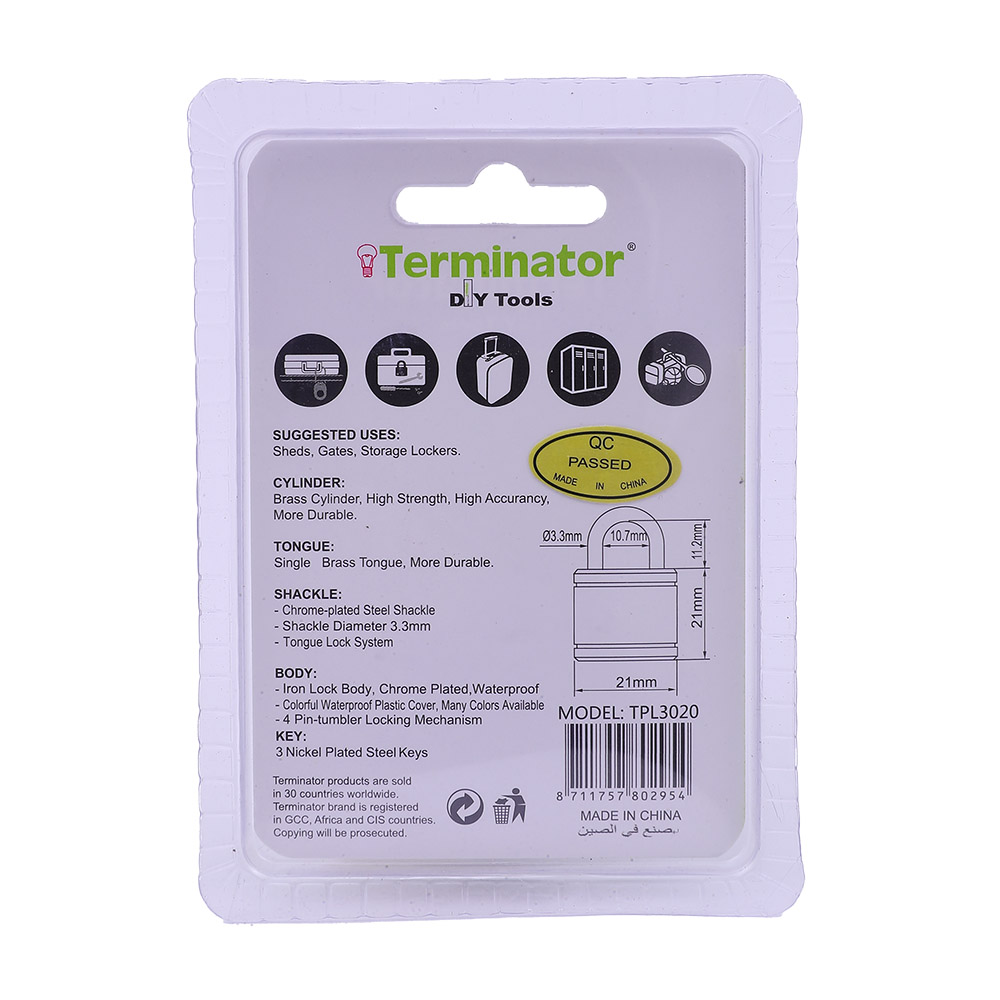 Guard your possessions with the Terminator Padlock 20-mm TPL3020. This durable padlock provides superior security for your belongings, giving you peace of mind wherever you go.