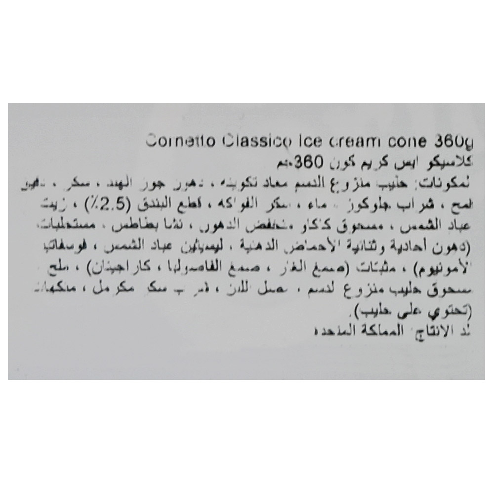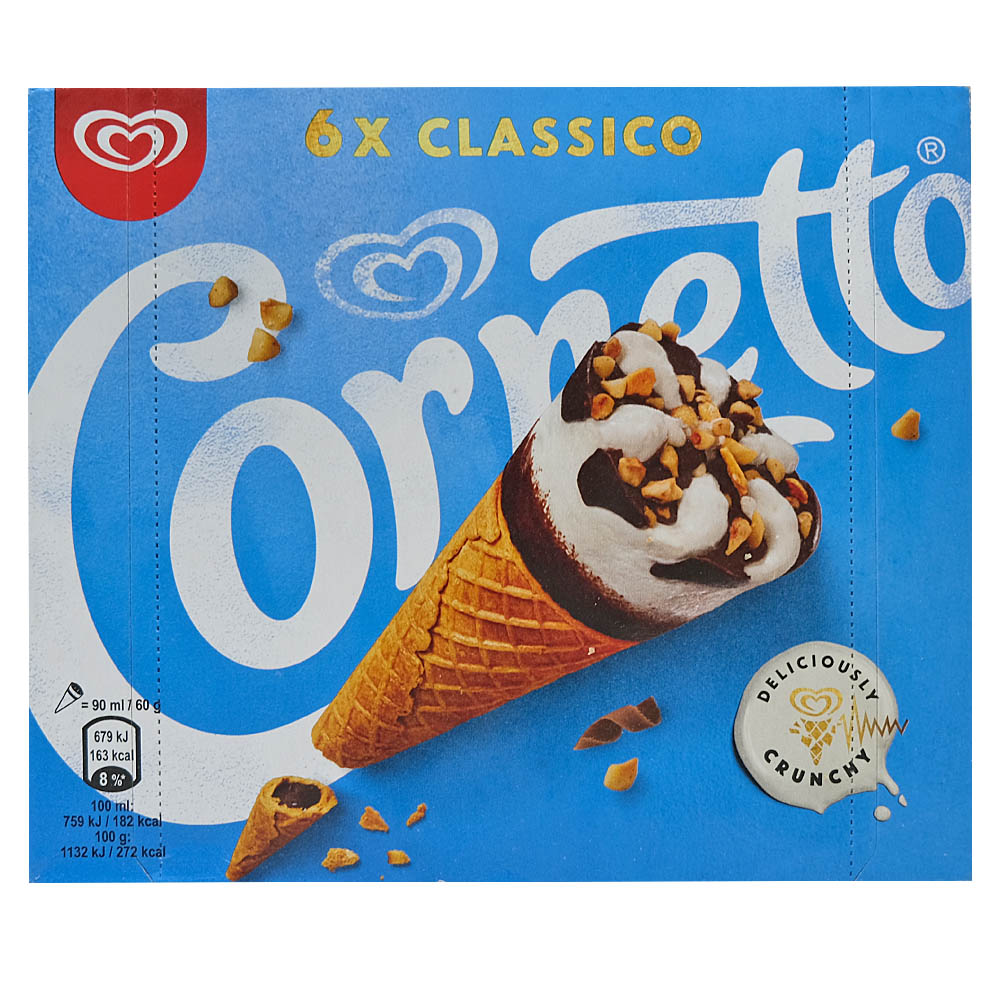 Indulge in the classic taste of Walls Cornetto Classico Ice Cream Cone. This delectable treat features a crisp wafer cone filled with creamy vanilla ice cream, topped with a delicious chocolate coating and crunchy nuts. Perfect for satisfying your sweet cravings on a hot day.